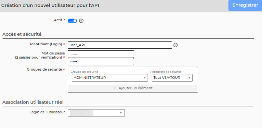 Prérequis : avoir les droits "Administration > Ecrans de base > Gestion des utilisateurs de l'API" et "Ajouter et modifier un utilisateur de l'API".