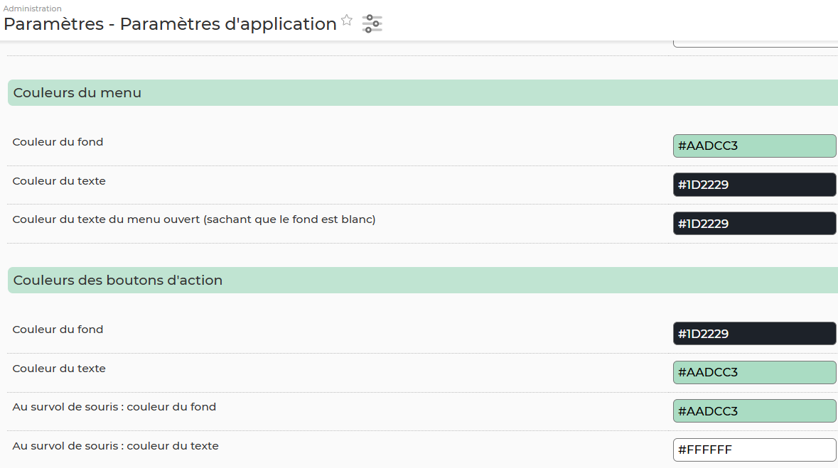 Oui, si vous disposez des droits nécessaires, vous pouvez personnaliser les couleurs des menus et des boutons de l'application à partir du menu Paramétrages.