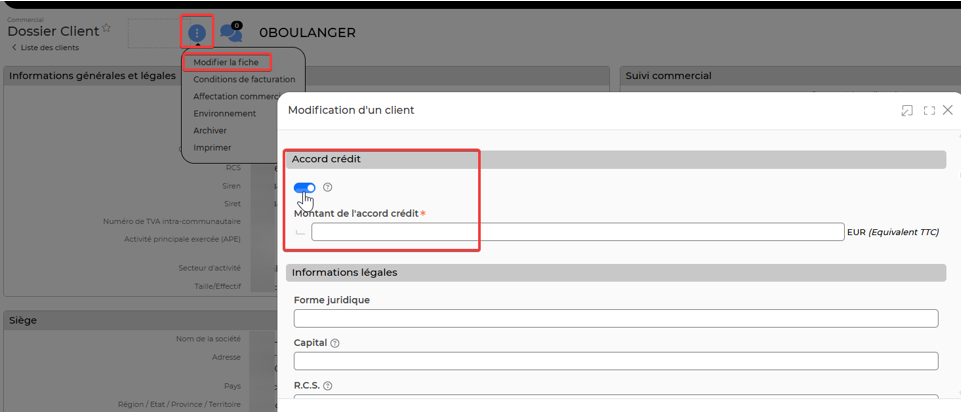 Sur un client, en modification de celui-ci, vous pouvez définir un montant de "crédit" (Accord crédit) qui correspondant au montant de son encours autorisé.