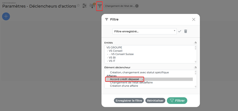 Afin d'être averti en temps réel quand un accord crédit est dépassé, nous avons ajouté un déclencheur d'action qui sera joué à la CREATION d'une affaire de ce client.