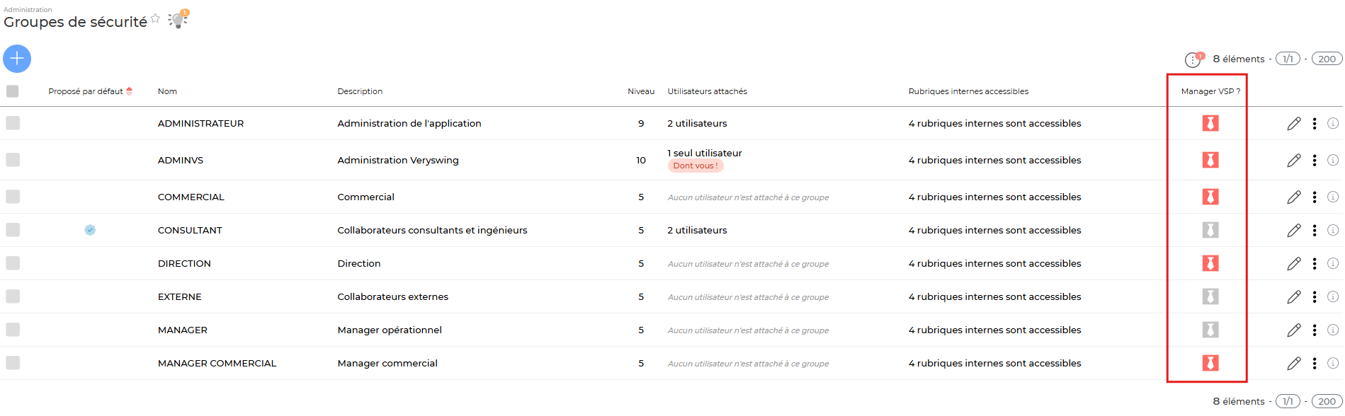 Un groupe de sécurité est considéré comme “Manager VSP” dès lors qu’au moins un droit associé à l’icône “cravate” est activé.